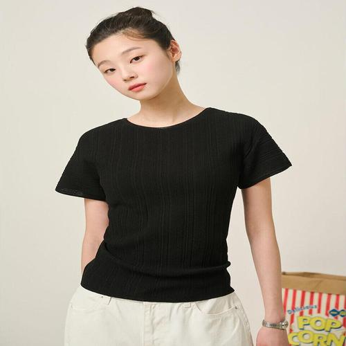 [빈폴레이디스]코튼 혼방 주름 반소매 풀오버 블랙 (BF5451C065) .