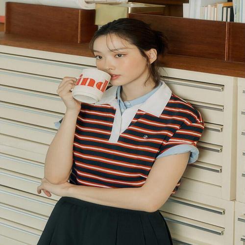 [빈폴레이디스]옥스퍼드 패치 스트라이프 루즈핏 T칼라 티셔츠 네이비 (BF5442C05R) .