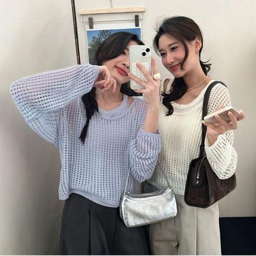 [에이치플러스몰]여성 4컬러 망사 레이어드 펀칭 그물 넷 니트 스웨터
