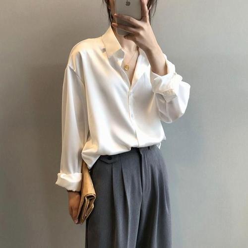[에이치플러스몰]부드러운 새틴 셔츠 카라형 오피스 룩