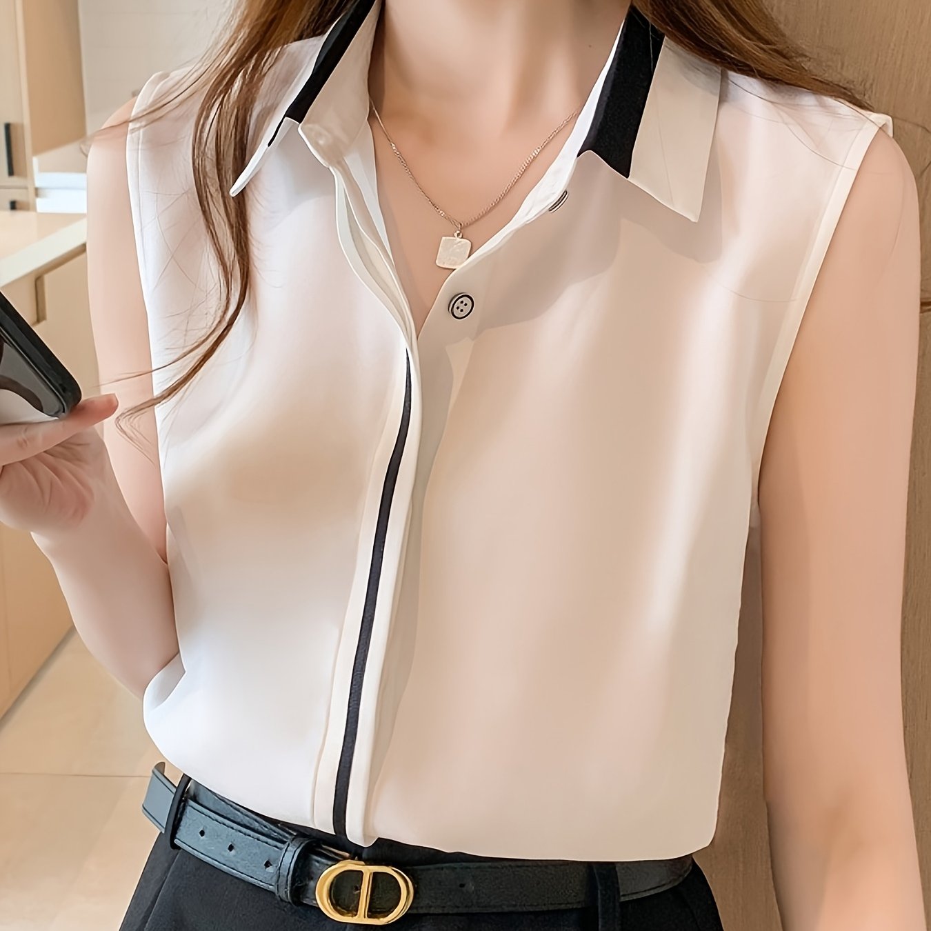TEMU 여성용 여름 민소매 대조 색상 블록 셔츠 - 클래식 칼라, 플레어 헴 & 싱글 버튼 클로저가 있는 가벼운 쉬폰 H-실루엣 블라우스, 캐주얼 아웃핏용, 기계 세탁 가능, 장식 목걸이 스타일, 쉬운 관리 원단, 통기성 소재, 트렌디한 탑