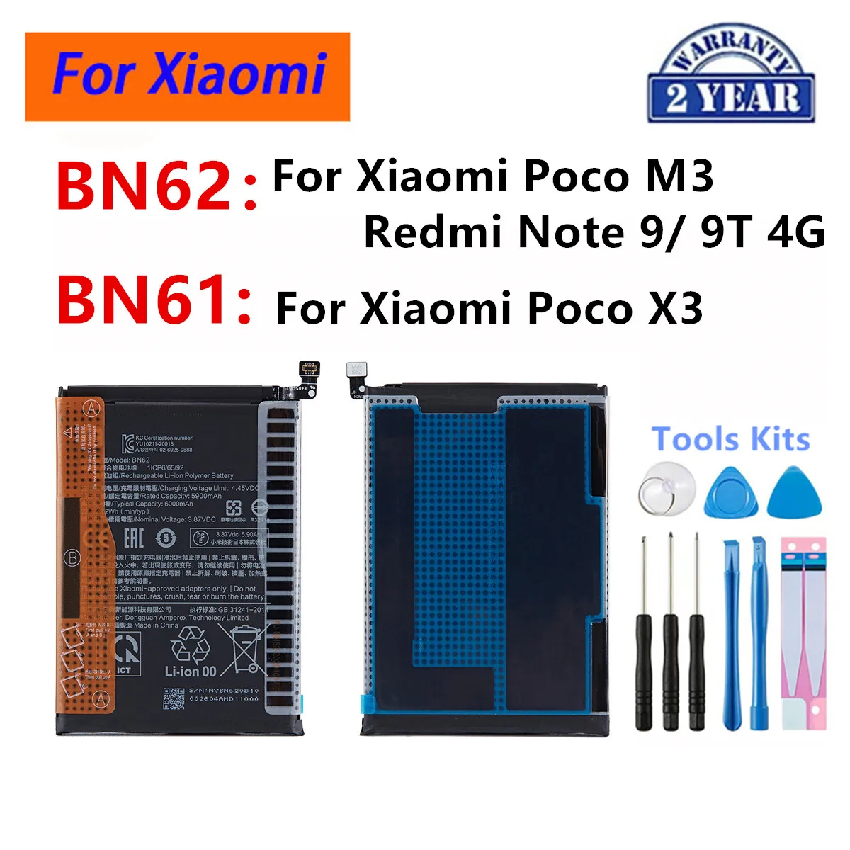샤오미 포코 M3 레드미 노트 9 레드미 9T 4G 포코폰 X3 포코 X3 휴대폰 배터리+도구용 새 배터리 BN62 BN61