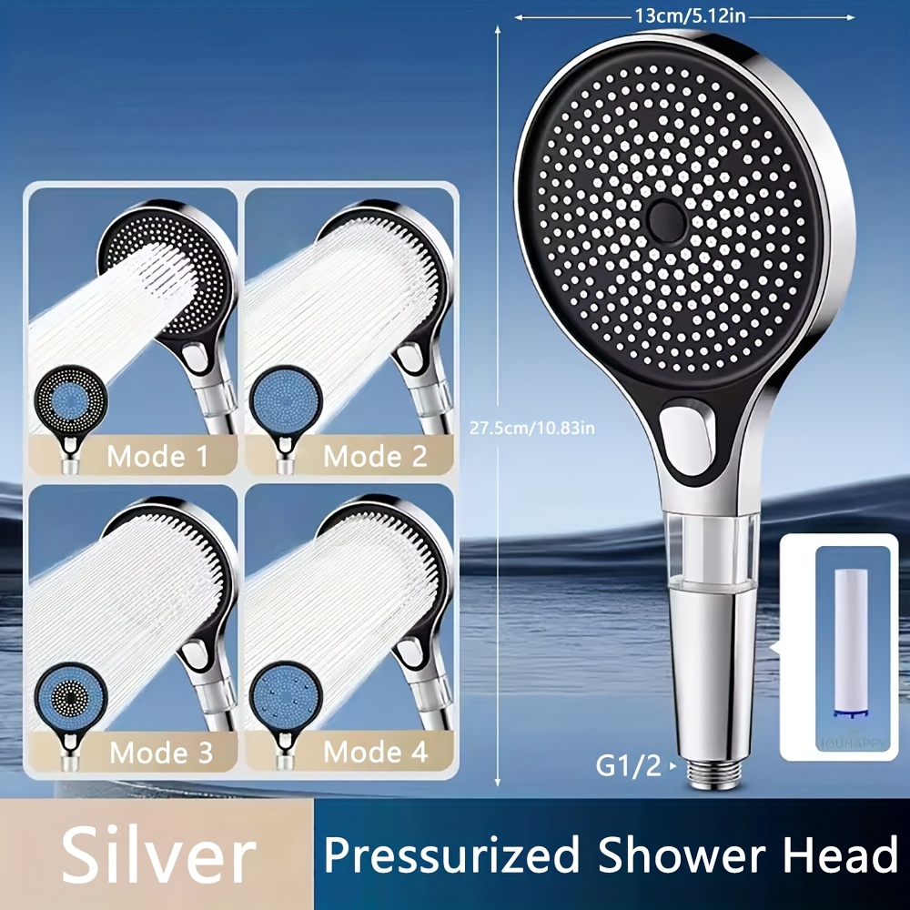 TEMU 1개 고압 4단계 샤워헤드 필터 포함, 욕실 핸드헬드 샤워, 고정형 대형 라운드 샤워헤드, 샤워 전용, 고품질 욕실 샤워, 욕실 액세서리, 스타일리시 샤워 액세서리, 실버, 블랙, 그레이 샤워헤드, 가벼운 무게, 사용 및 설치 간편