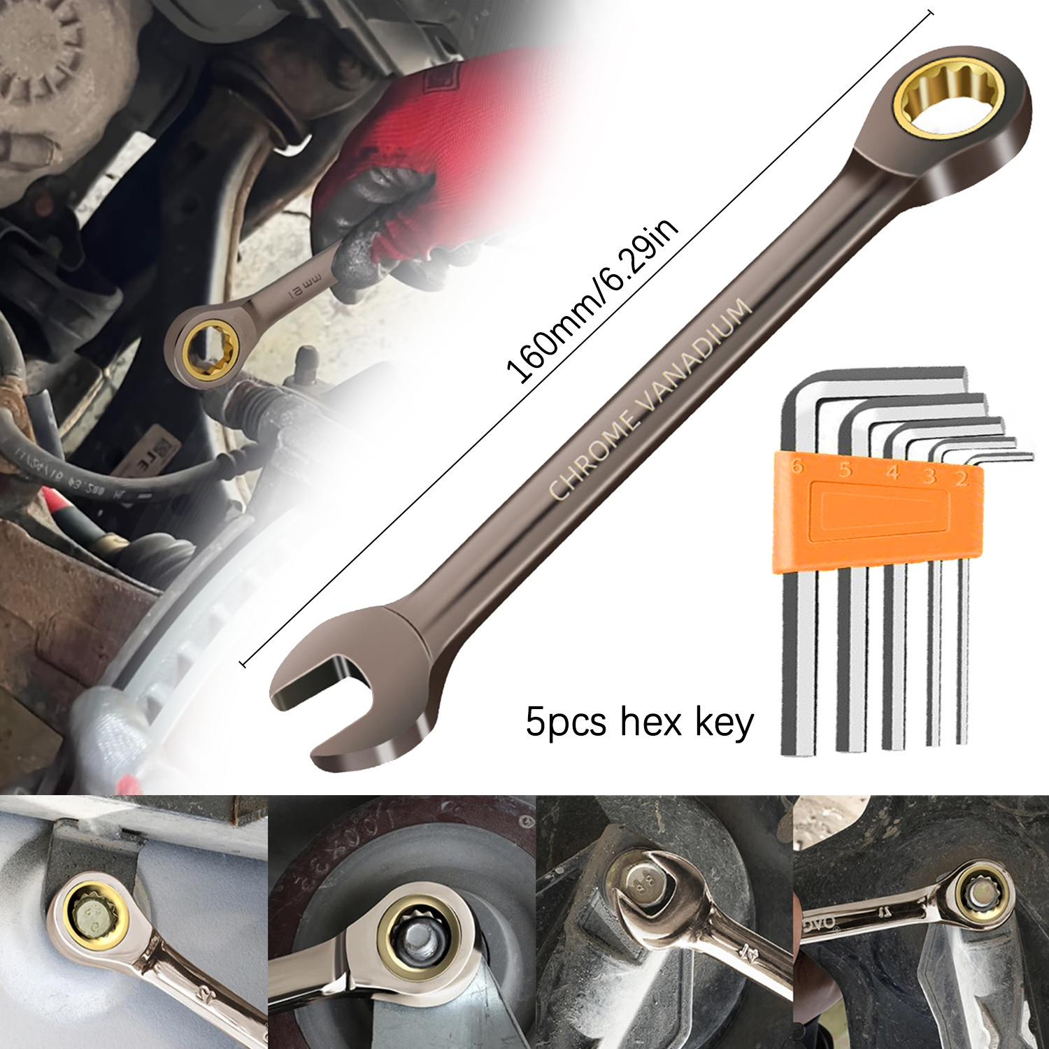 TEMU 6개 검정 니켈 고정 헤드 라쳇 렌치 세트, 72톱니 정밀 기어 라쳇 렌치, 라쳇 렌치 1개, 육각 렌치 5개 포함, 가정용 도구, 수리 필수 장비, 자동차 수리 도구, 하드웨어 도구
