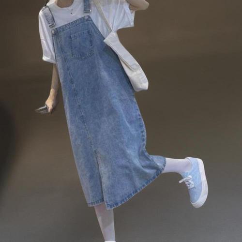 [미라클세븐]여성 캐주얼 면 혼합 멜빵 데님 롱 드레스 사선 포켓