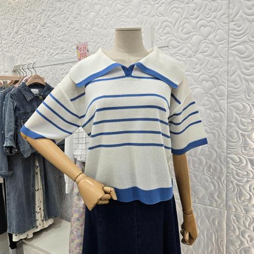 [옷자락]여성 캐주얼 세일러 카라넥 배색 단가라 반팔 니트