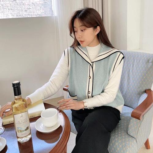 [옷자락]여자 울혼방 무지 세일러 카라넥 단추 니트 가디건