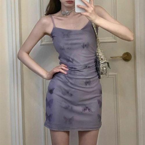 이쁘다요 퍼플 나비 셔링 탑 휴가룩 여름 드레스 원피스 롱 숏 나시 WFLMPM1