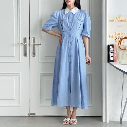 [다잇템]여자 여성스러운 벌룬 SS 잔주름 남방 롱원피스 (16005232A)