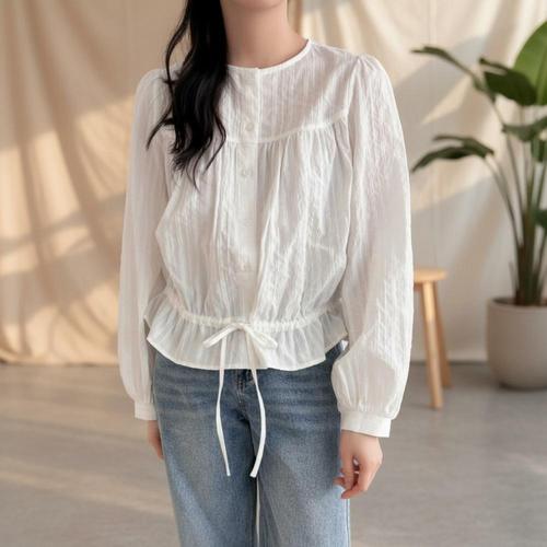 [옷자락] 여성 라운드넥 퍼프소매 셔링 블라우스