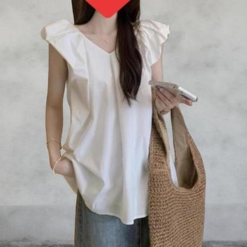 [다잇템]여성 프릴 민무늬 소매 V넥 귀여운 블라우스 (41250601A)
