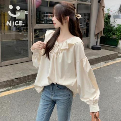 오피스 레이디 긴소매 프릴 블라우스, 흰색 셔츠, 여성 싱글 단추 버튼, 단색, 피터팬 칼라 상의, 가을/봄 상품