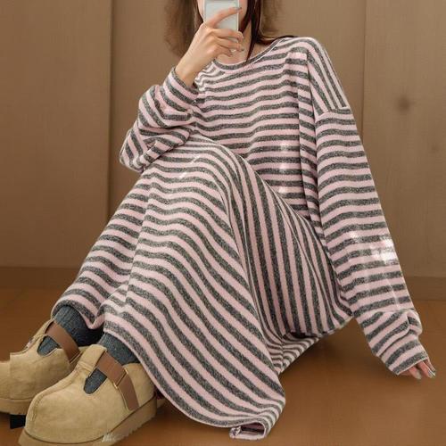 [미라클세븐]여성용 겨울 홈웨어 빅사이즈 스트라이프 옆트임 기모 롱드레스