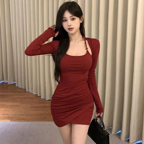 [다잇템]여자 쁘띠 잔주름 롱슬리브 숏가디건 원피스