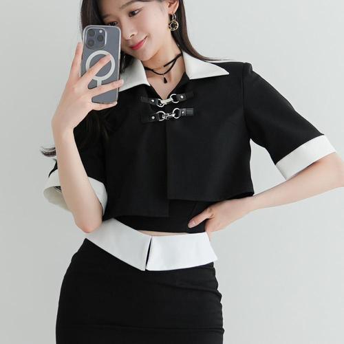 [VY] 여자 반소매 숏가디건 버클 콘트라스트 자켓