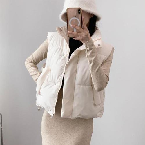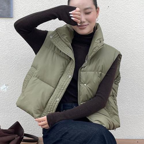 [리비닛] 여성용 겨울 경량 하이넥 허리 사이즈 조절 무광 크롭 숏 패딩조끼 아우터