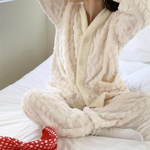 남녀공용 겨울 커플 파자마 세트 피치기모 면 수면잠옷 따뜻한 홈웨어 커플잠옷