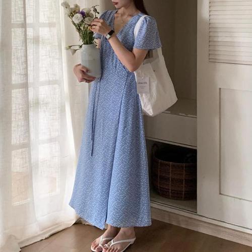 [다잇템]여성 플라워패턴 귀여운 랩 롱 V넥 원피스 (41037102A)