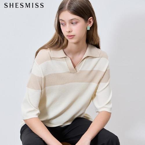[쉬즈미스(SHESMISS)] 밑단 언발란스 스트라이프 반팔 니트 탑 (택가격: 138000원)