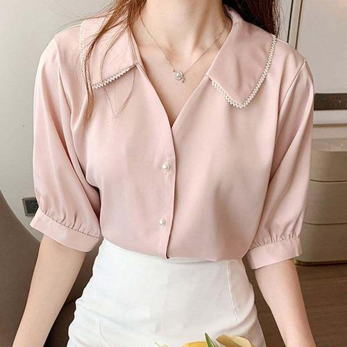 [셀럽하우스]브이넥 MUXX5784 진주 반팔 쉬폰 블라우스 직장인 러블리