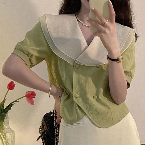 [셀러허브_여성트랜드패션]여성 블라우스 은은한 쉬폰 반팔 광택 랩스타일 셔츠