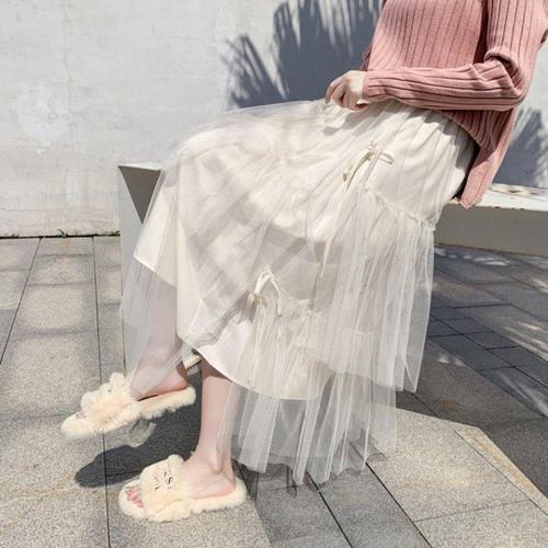 [오너클랜]인기상품 쉬폰 롱 캉캉 스커트 여성용 봄 망사 리본 디테일 [WFLLOCG_260305]