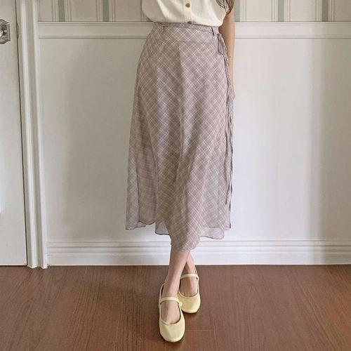 [옷자락]여성 베이지 블랙 체크 패턴 쉬폰 롱 스커트