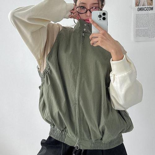 [옷자락] 여자 배색 워크자켓 하이넥 집업 스모크밴딩 면 조끼