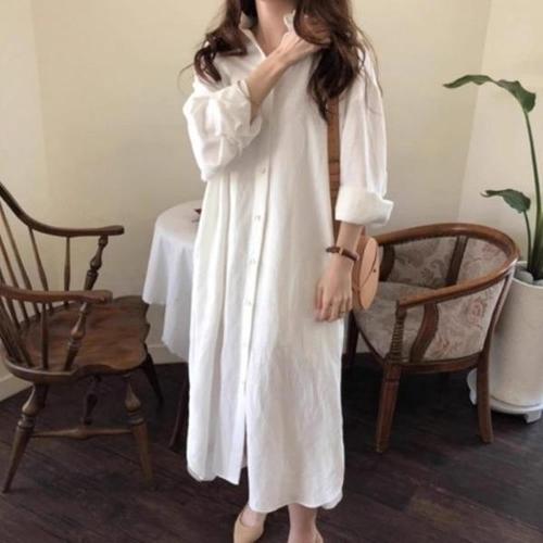 옷자락 / 여성 소프트 린넨 카라넥 루즈핏 셔츠 롱 원피스