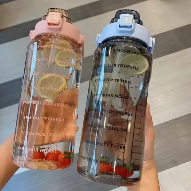 대용량 플라스틱 빨대 휴대용 스포츠 밀짚 물병 시간 마커 2L 대용량 컵, 손잡이가있는 물 주전자