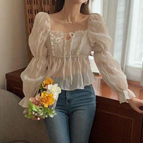 [다잇템]여자 리본끈블라우스 스퀘어넥 엷은 블라우스 (15723223A)