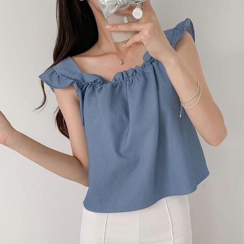 [다잇템]여자 귀여운 프릴 스퀘어넥 진 블라우스 (16732617A)