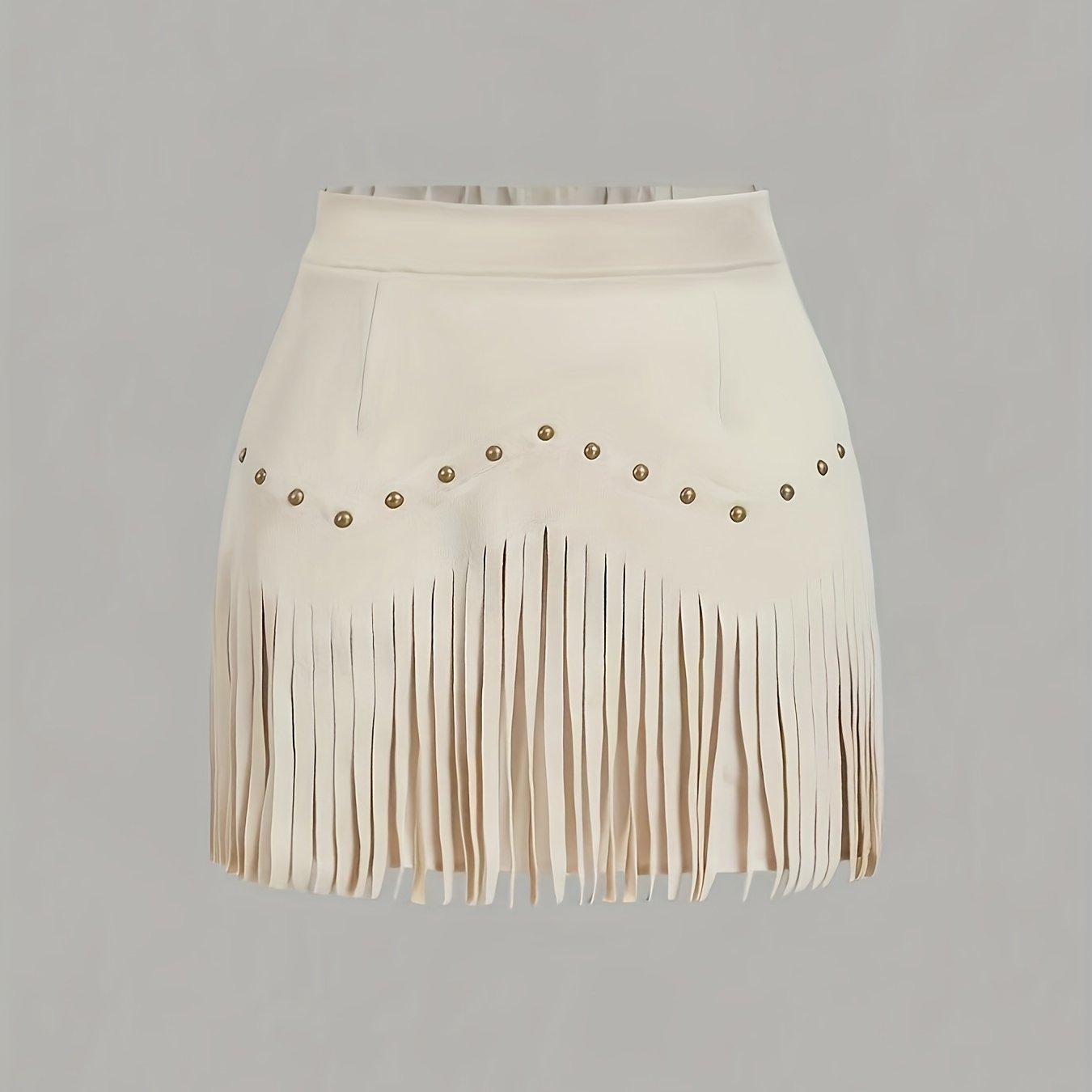 TEMU 여성용 빈티지 프린지 헴 A라인 스커트 - 프린지 태슬 & 벨트리스 디자인, 솔리드 브라운 숏 길이, 봄/가을/여름에 어울리는 구조적 핏, 캐주얼부터 포멀 이벤트까지 - 손세탁 가능한 프린지 스커트, 데일리 & 특별한 날을 위한 레트로 스타일, 프린지 디테일, A라인 실루엣, 슬릿 헴 디자인으로 매력적인 핏, 크리스마스 스커트