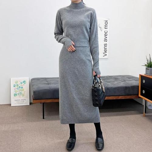 [다잇템]여자 가을 겨울 목폴라 니트 롱 투피스 세트