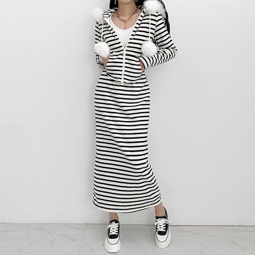 [금찌]글램 엘리스 스트라이프 방울 기모 후드집업 스커트 세트 JK7561S