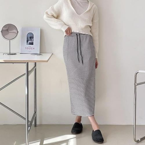 지고다그 여성용 봄용 줄무늬 니트 밴딩 스커트 중장기장 신축성 좋은 타이트핏 캐주얼 슬림핏 하의 ZK6063