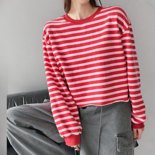 옷자락 / 여성 레드 스트라이프 기모 컷팅 크롭 라운드넥 맨투