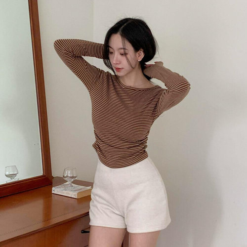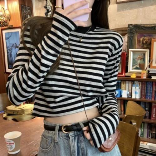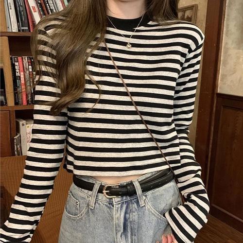 [라일리여성의류] Rly 여성 슬림 롱슬리브 크롭 라운드 스트라이프 긴팔