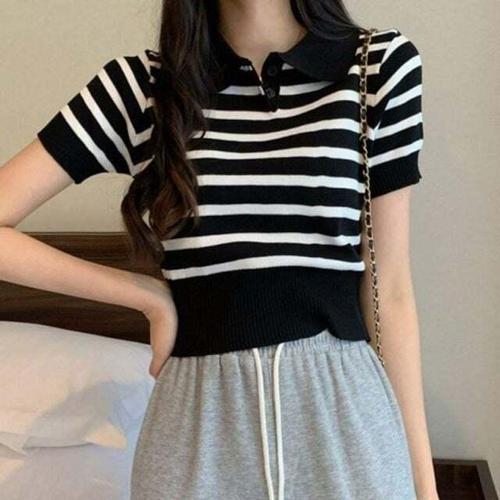 [셀럽하우스]스트라이프 AQDZ2022 여름 캐주얼 패턴 크롭 필수템 기장 카라
