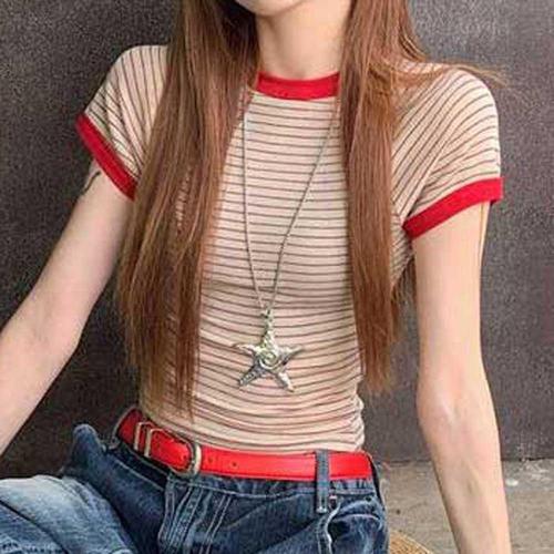여성용 스트라이프 티셔츠 슬림핏 반팔티 데일리 크롭 WFJFYNJ