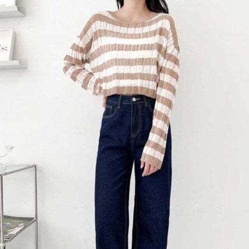 [셀럽하우스]봄 KSFT8418 가을 여자 반크롭 스트라이프 가디건 긴팔 티셔츠