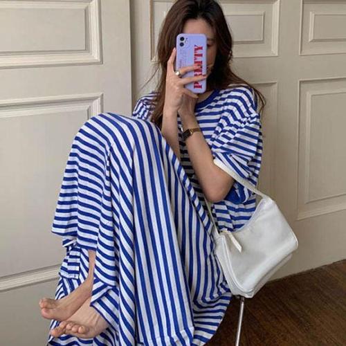 [라일리여성의류] Rly 단가라 반팔 롱원피스 스트라이프 7부 여름원피스