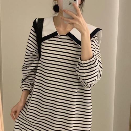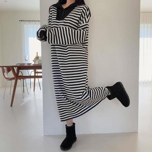 지고다그 여성 봄가을 니트 스트라이프 원피스 롱슬리브 루즈핏 캐주얼 데일리룩 GJX3565