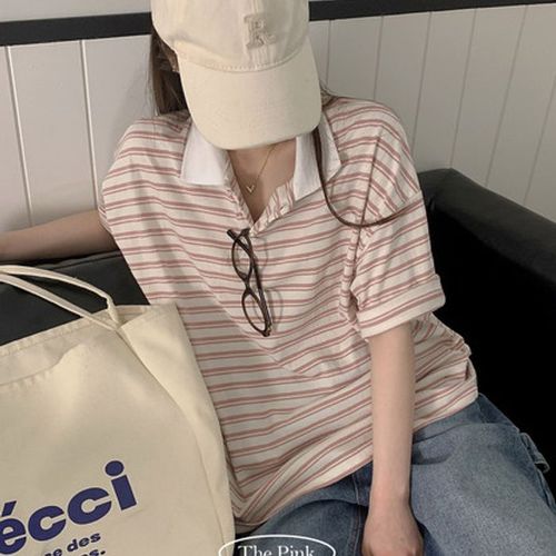 더핑크 / 타릴 오버핏 카라 스트라이프 반팔티