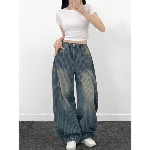 해피유통 여성용 봄 가을 겨울 스트라이프 하이웨이스트 와이드핏 데님 팬츠 캐주얼 청바지lmy