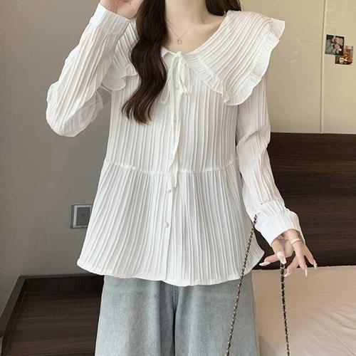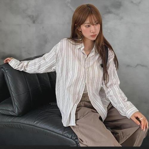 여성 세미 크롭 스트라이프 기본 카라 긴팔 블라우스 가을 시즌