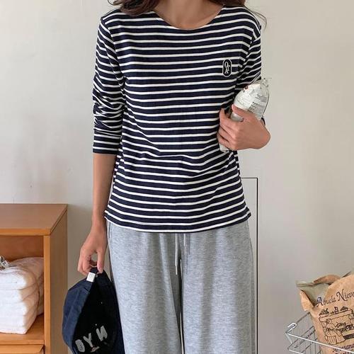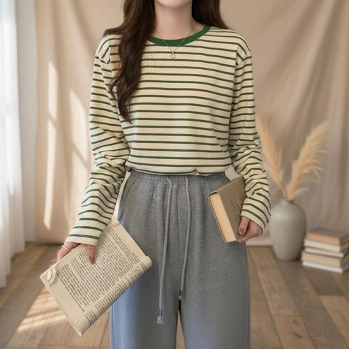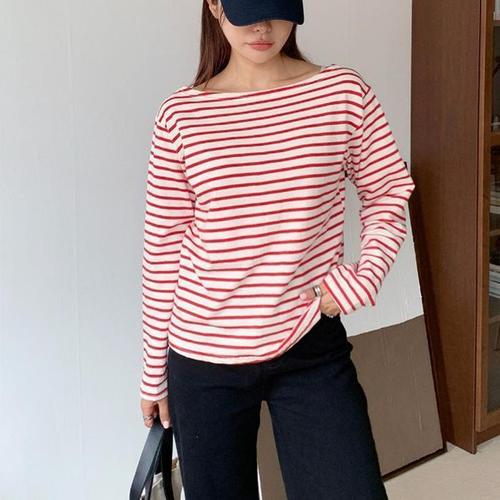 [다잇템]여자 U넥 순면 캐주얼 스트라이프티셔츠 긴팔티 (18335888A)
