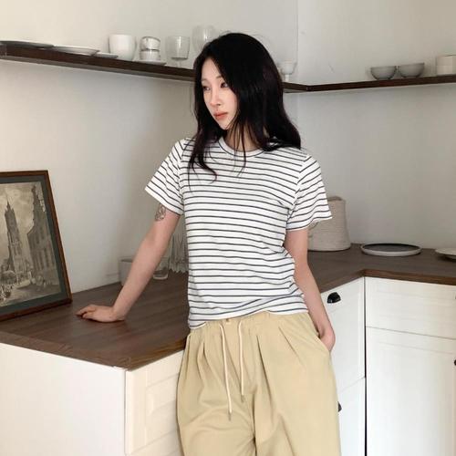 [옷자락] 여자 라운드넥 스트라이프 세미 크롭 신축성 반팔티