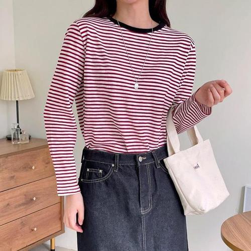 [옷자락] 여성 스트라이프 라운드넥 루즈핏 긴팔 티