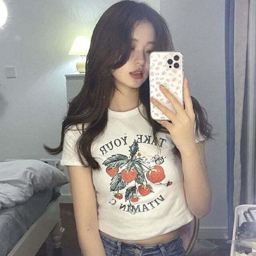 러블리 귀여운 크롭 면티 딸기 티셔츠 WFJFYBE